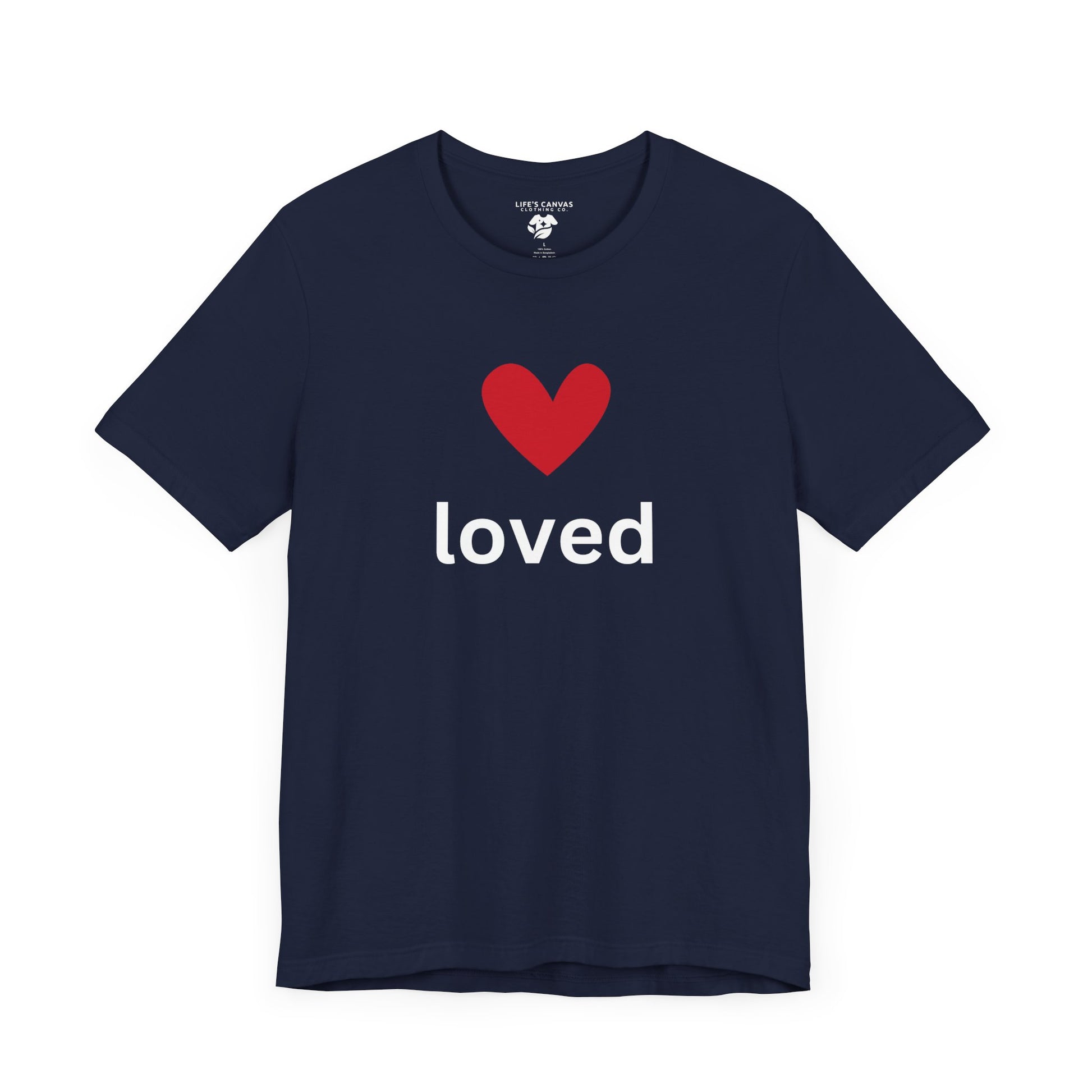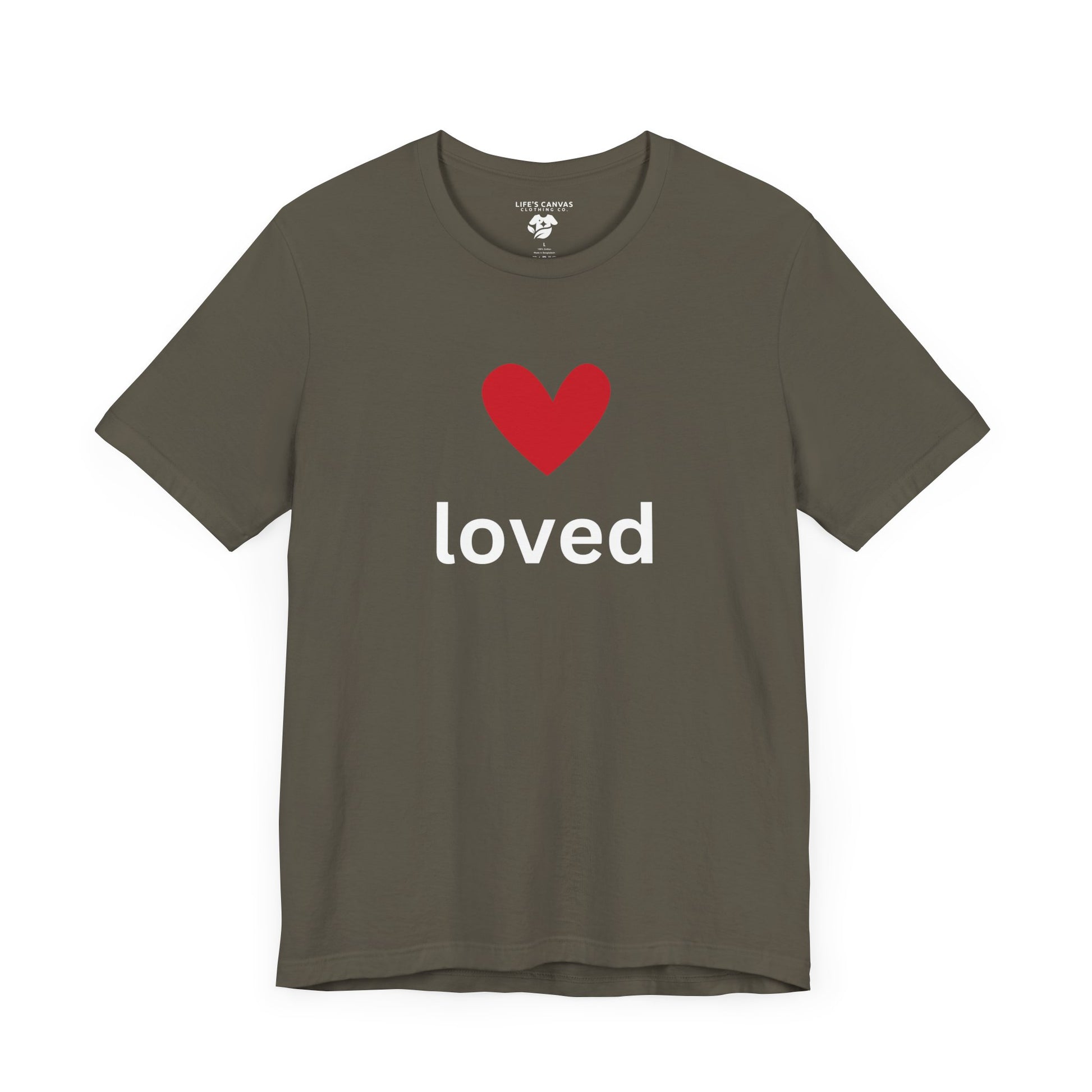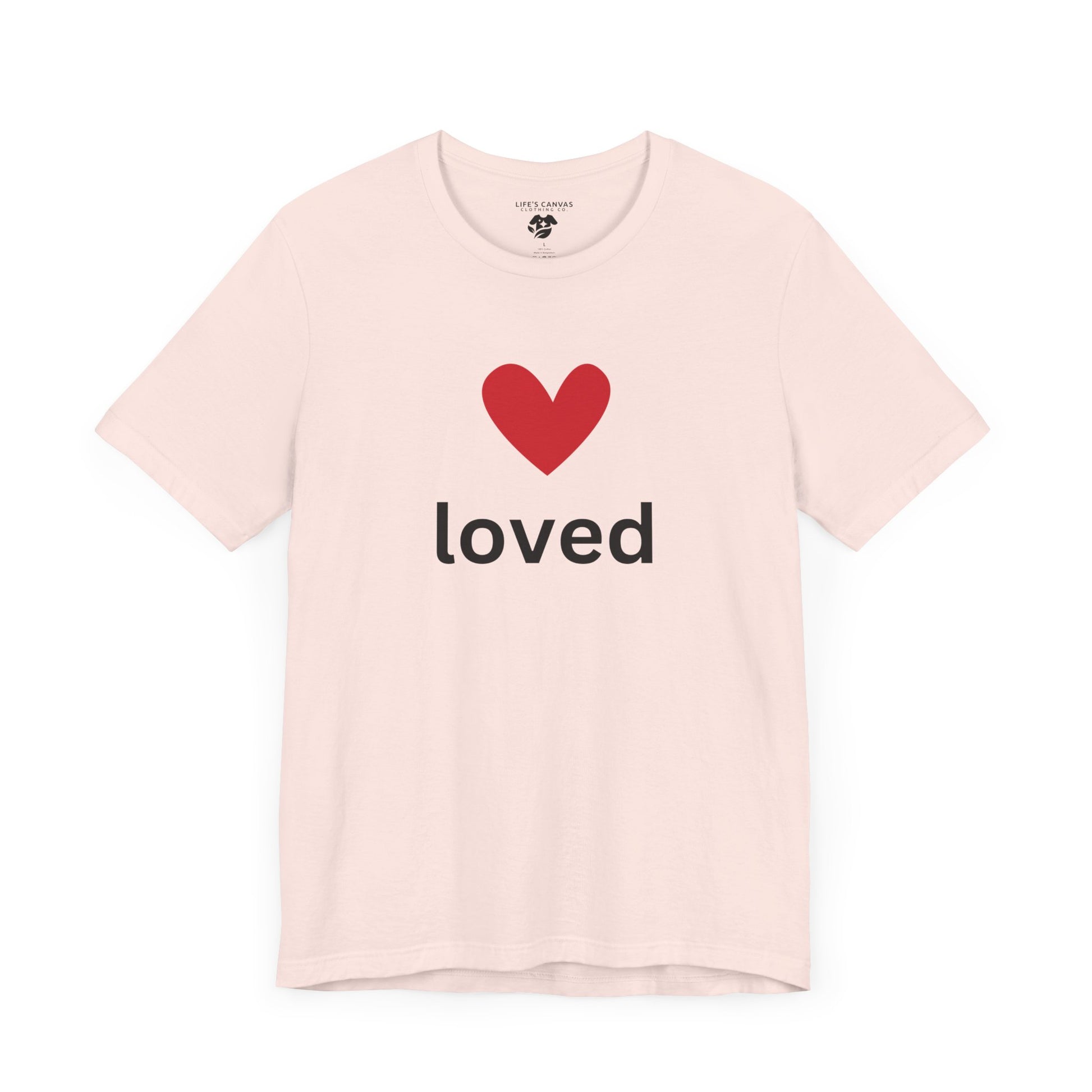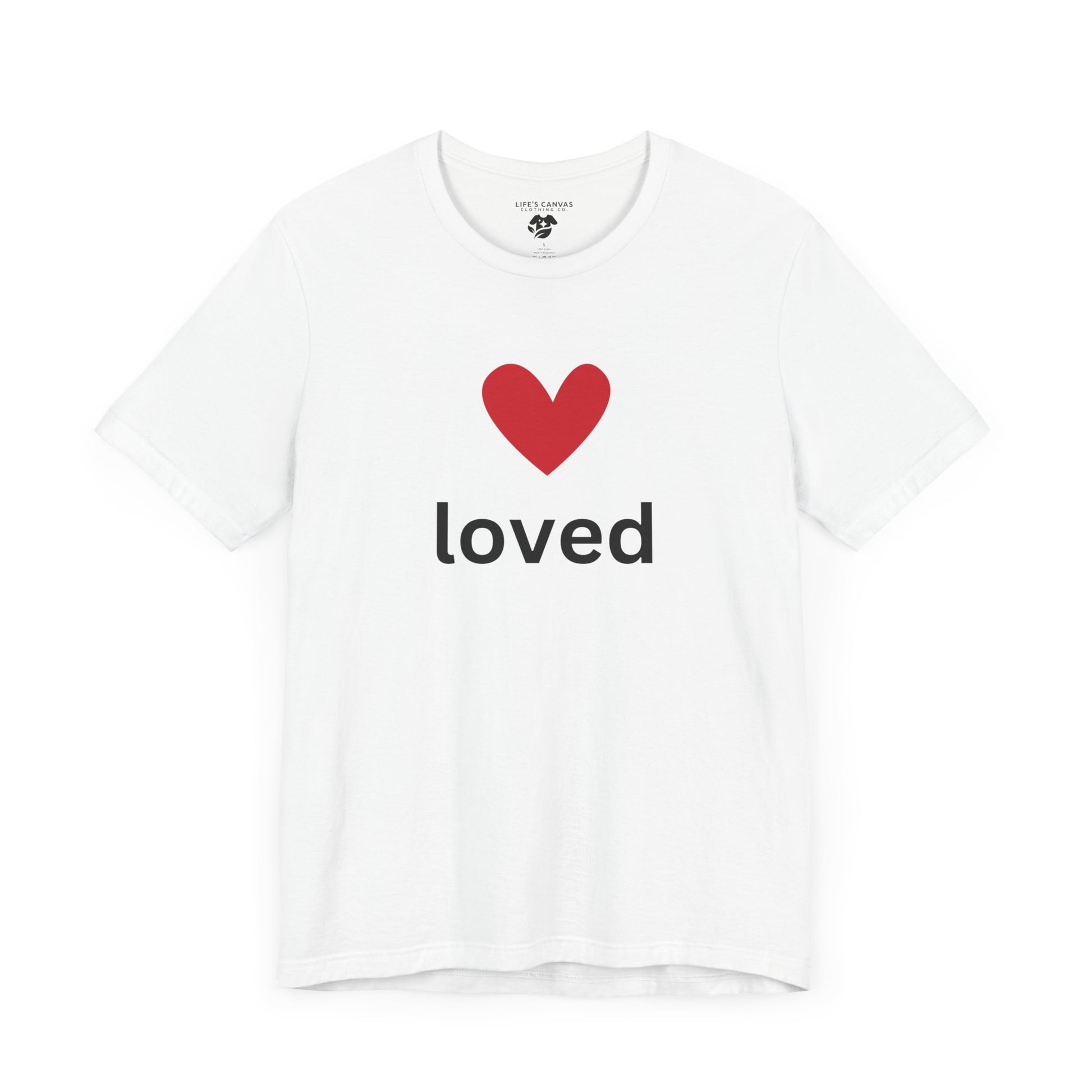 “Loved” Unisex T-Shirt with Red Heart Above [A HEARTFULL REMINDER YOU ARE LOVED!]