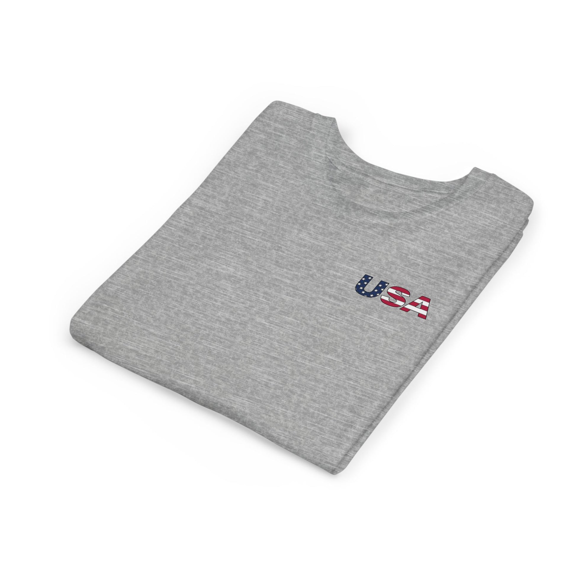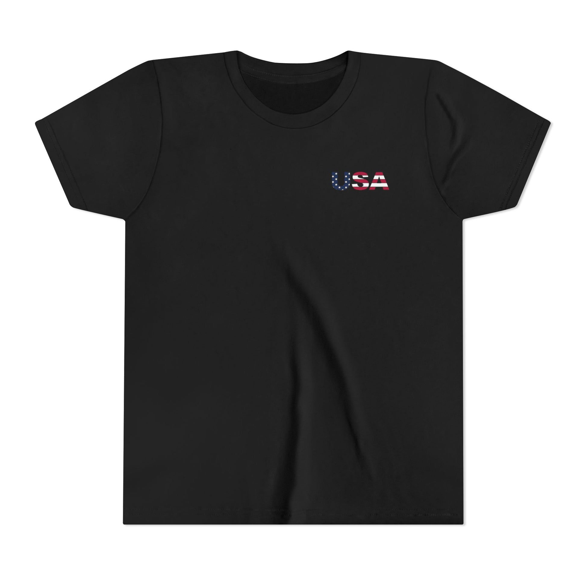 Forming the shape of the American flag on the back, these words become a reminder of what patriotism can and shouldstand for—justice, unity, and hope. With a simple USA print on the front and impactful type-based artwork on the back, this shirt lets young ones wear their values with pride.